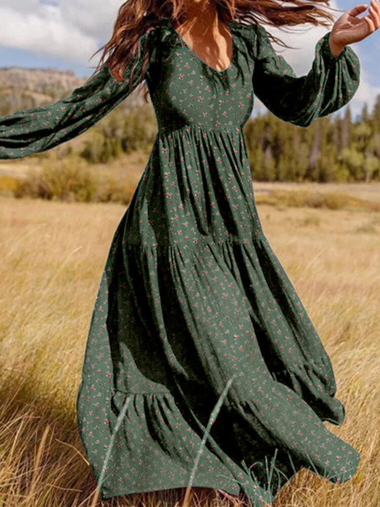 V-hals Rygg Glidelås Blomstertrykt Uformell Løs Kjole For Kvinner